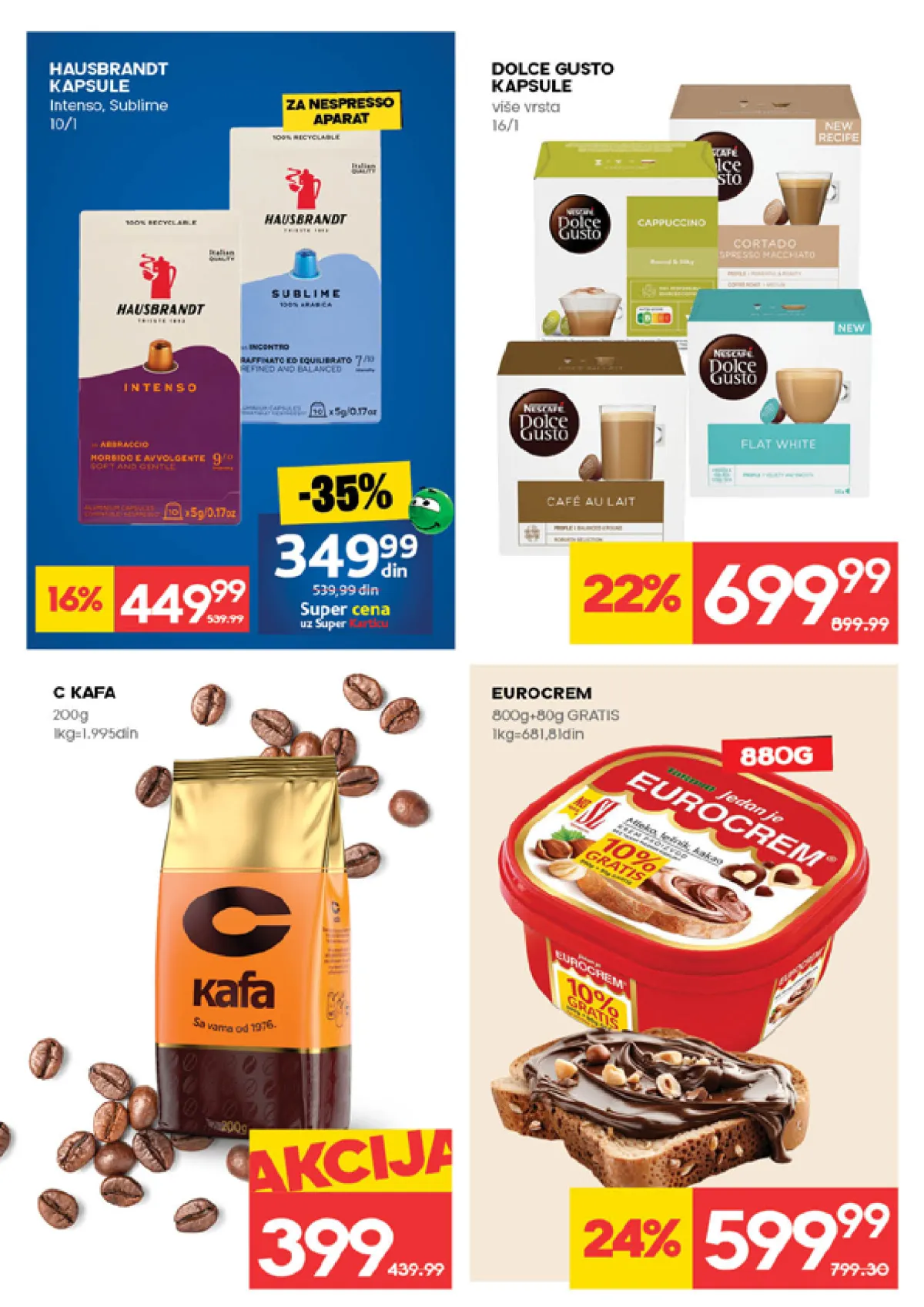 Na stranici broj 14 od 32 kataloga Nedeljna akcija prodavnice Mercator postoje proizvodi: kafa, gusto, cappuccino, dolce gusto, eurocrem, kapsule, nespresso.