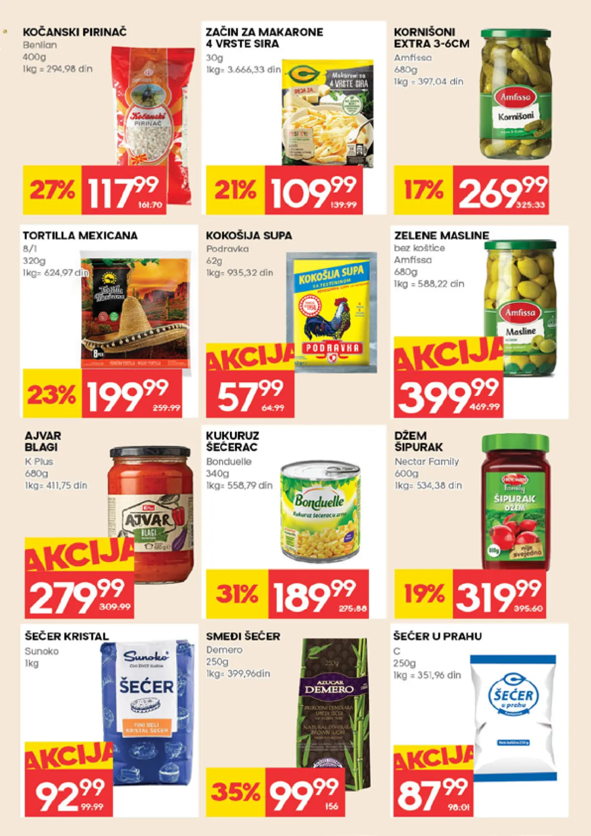 Na stranici broj 17 od 32 kataloga Nedeljna akcija prodavnice Mercator postoje proizvodi: šećer, pirinač, podravka, začin, kukuruz, ajvar, nectar, bonduelle, demero, džem, k plus, kornišoni, masline, nectar family, šećer kristal.