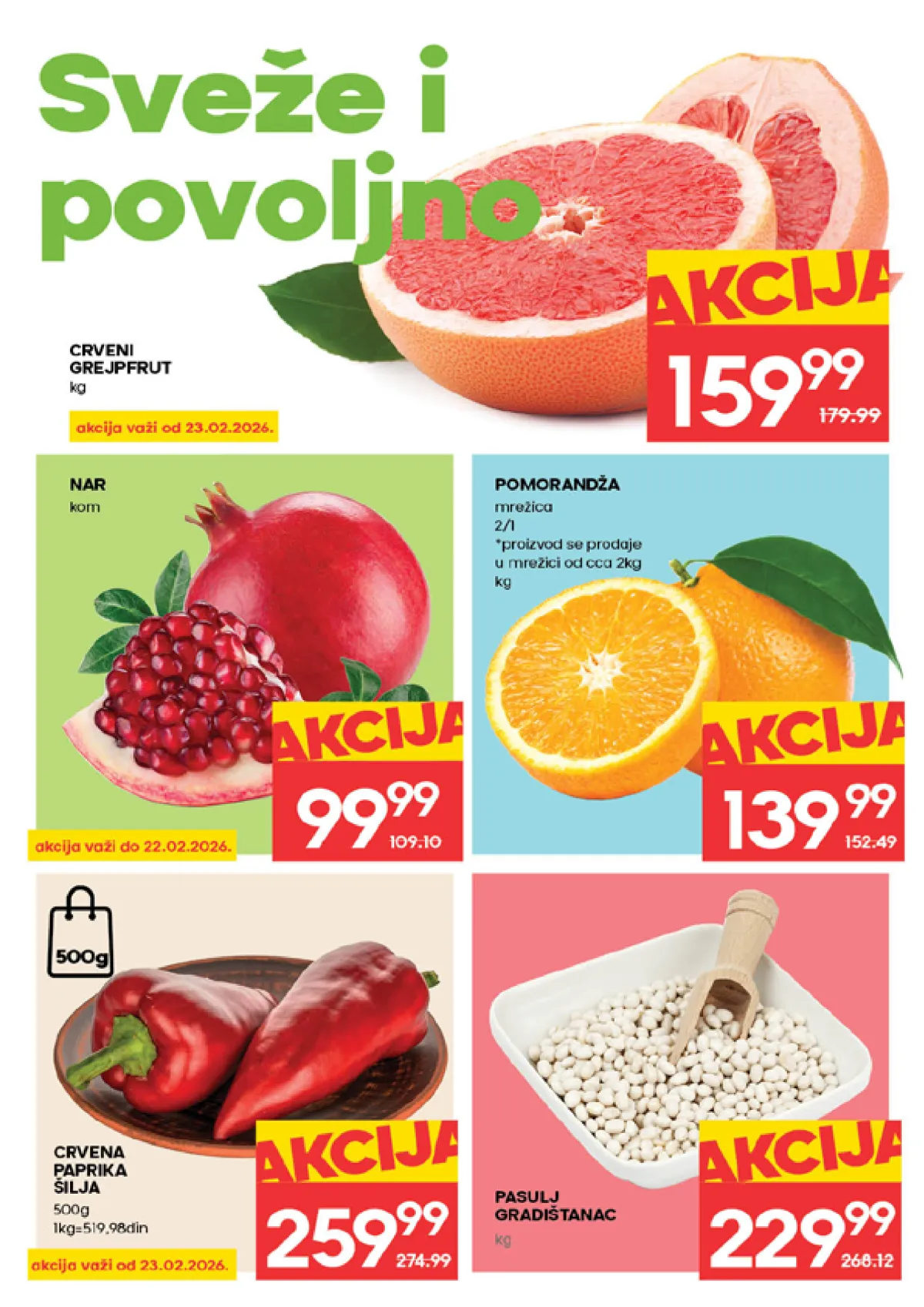 Na stranici broj 2 od 32 kataloga Nedeljna akcija prodavnice Mercator postoje proizvodi: paprika, pasulj, grejpfrut, nar, paprika šilja, pomorandža.